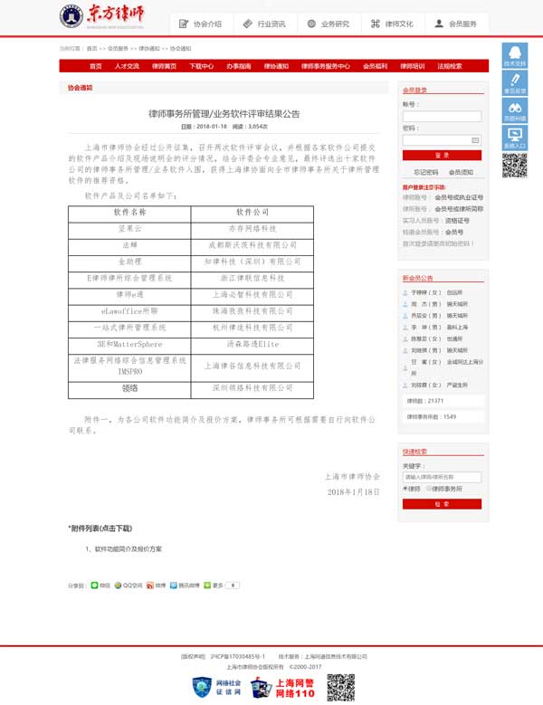 上海市律師協(xié)會經(jīng)過公開征集,召開兩次軟件評審會議,并根據(jù)各家軟件公司提交的軟件產(chǎn)品介紹及現(xiàn)場說明會的評分情況,結(jié)合評委會專業(yè)意見,最終評選出十家軟件公司的律師事務(wù)所管理/業(yè)務(wù)軟件入圍,獲得上海律協(xié)面向全市律師事務(wù)所關(guān)于律所管理軟件的推薦資格。