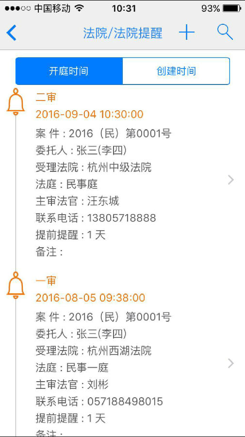 開庭提醒:可以自設置提前幾天提醒,開庭2小時前,系統(tǒng)默認再次提醒